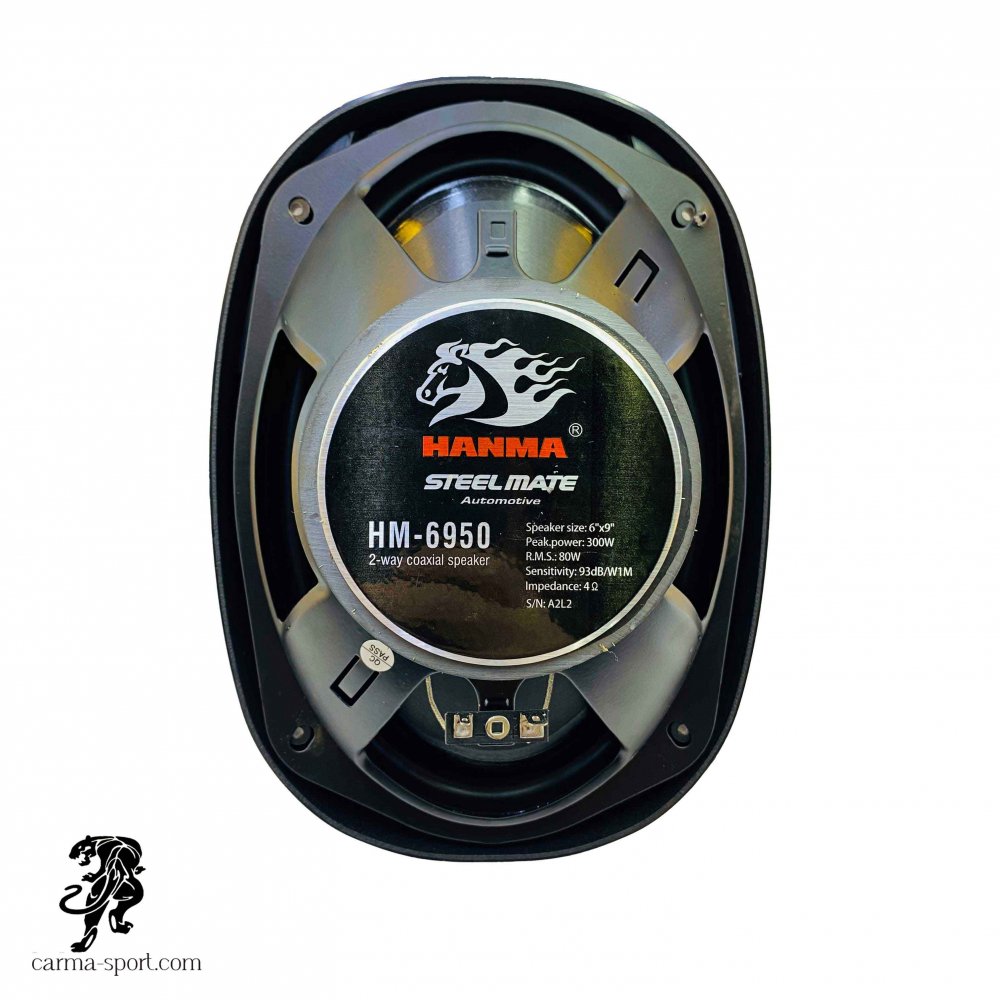 بلندگوی بیضی HANMA مدل HM-6950 یک بلندگوی 6x9 اینچی است که برای ارائه صدای باکیفیت در خودرو شما طراحی شده است. این بلندگو با حداکثر توان 300 وات و توان اسمی RMS 150 وات، می‌تواند صدای قدرتمندی را به شما ارائه دهد. بازه فرکانسی آن نیز 50 هرتز تا 20 کیلوهرتز است که طیف وسیعی از صداها را پوشش می‌دهد.